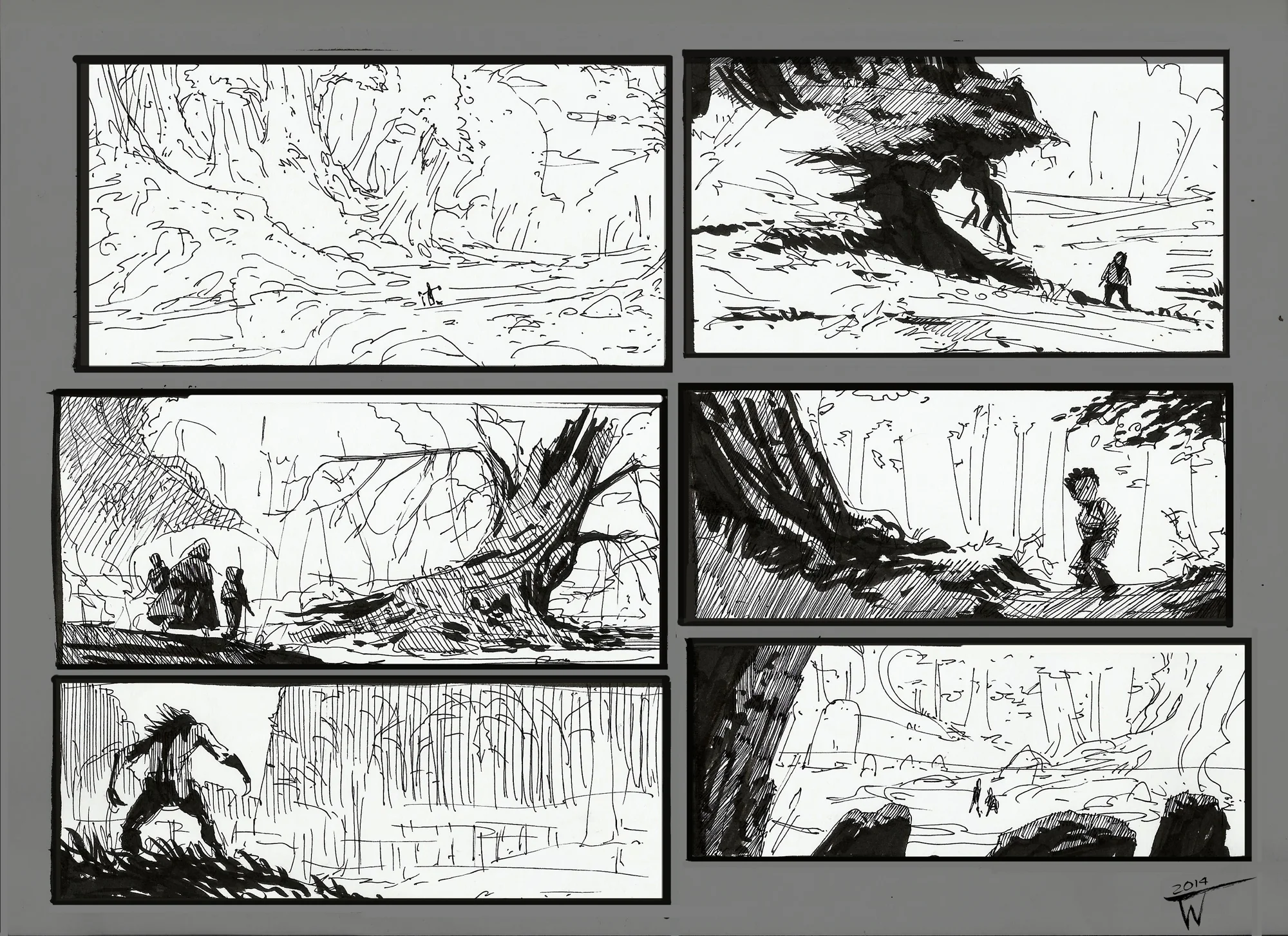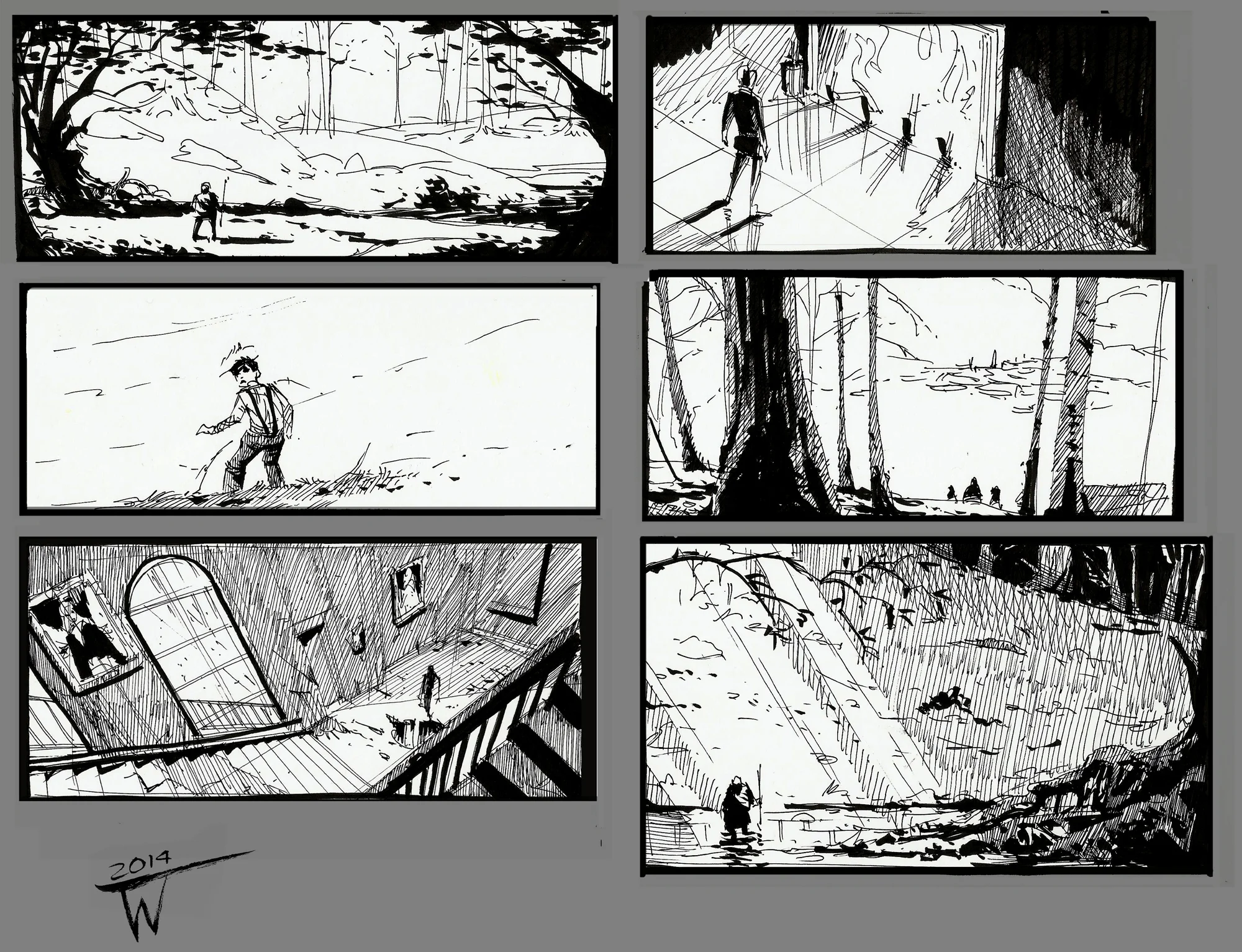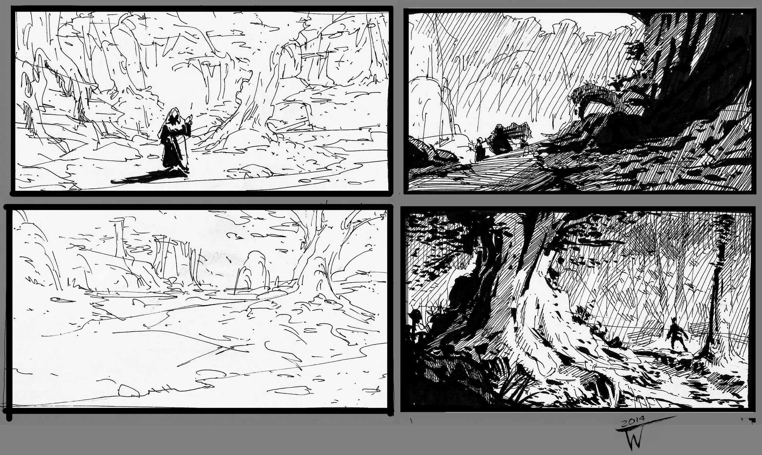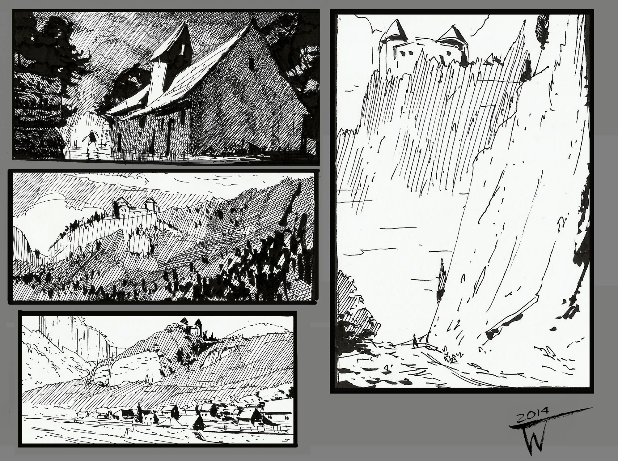 Here are some sketches i did today. There all very quick. I am trying to find good compositions to tell the basic story of different locations. This is a new personal project that I am starting to develop again. I have looked at Arthur Rackham for trees and storytelling as well as looked at other books that i have around the studio.