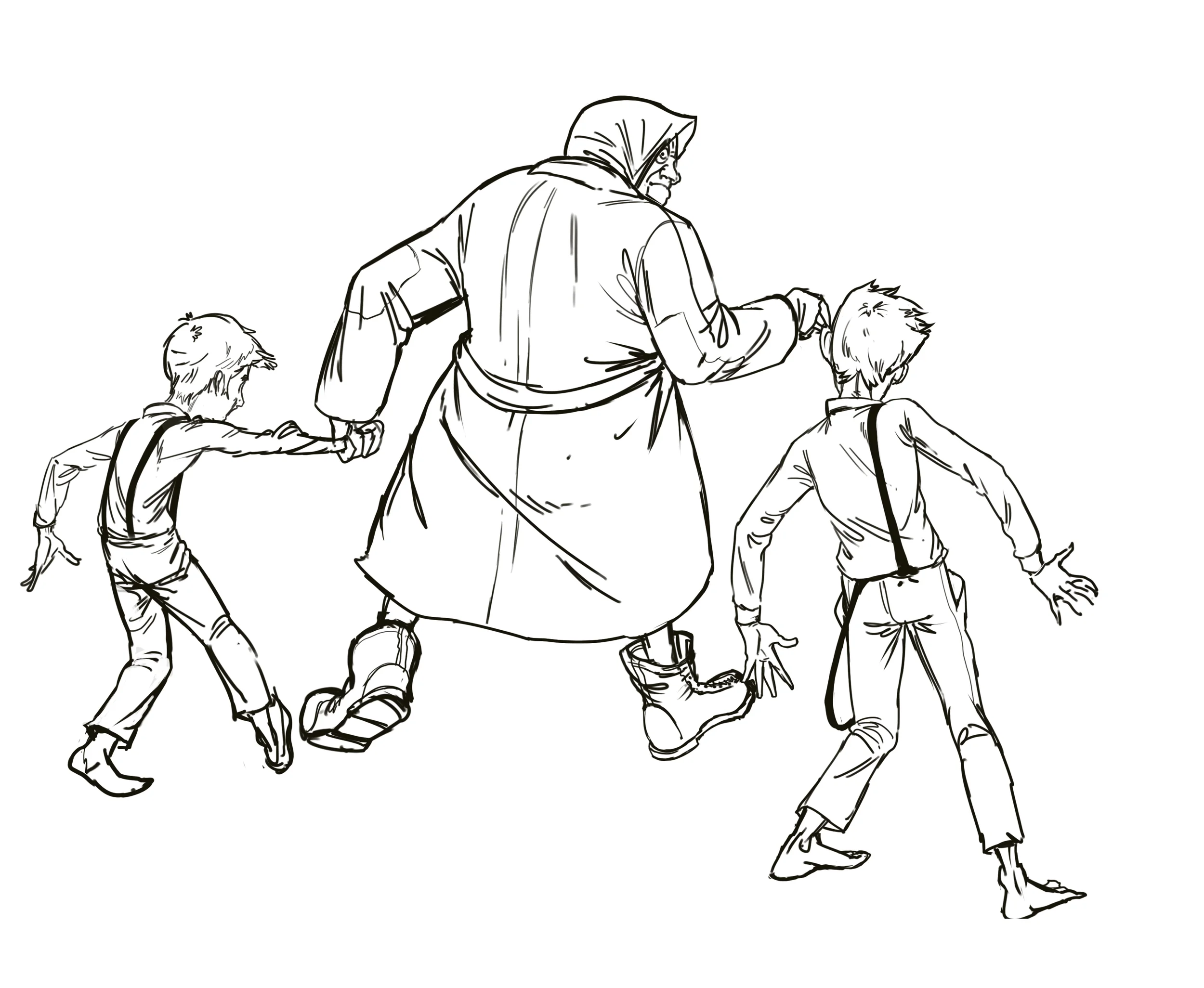 Here is the Drawing i Did of the Grandmother dragging her grand children into the woods.